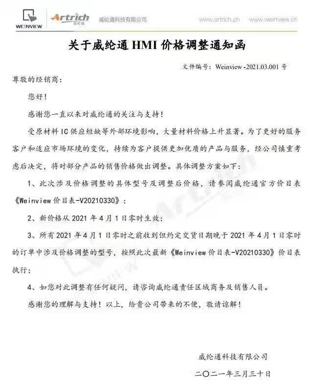 威纶通价格调整通知