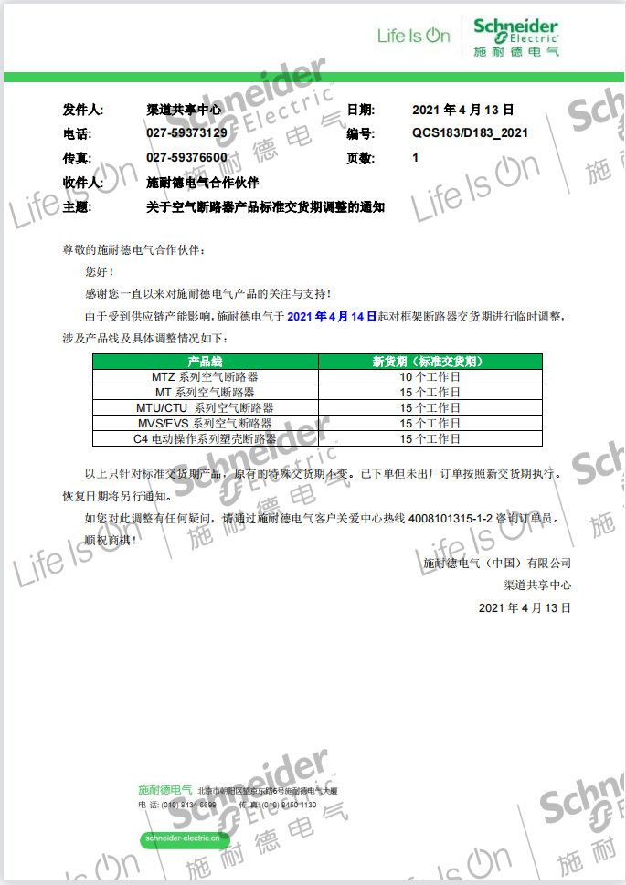 施耐德断路器产品标准交货期调整的通知