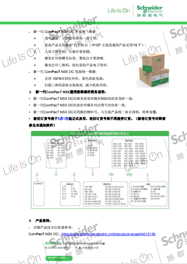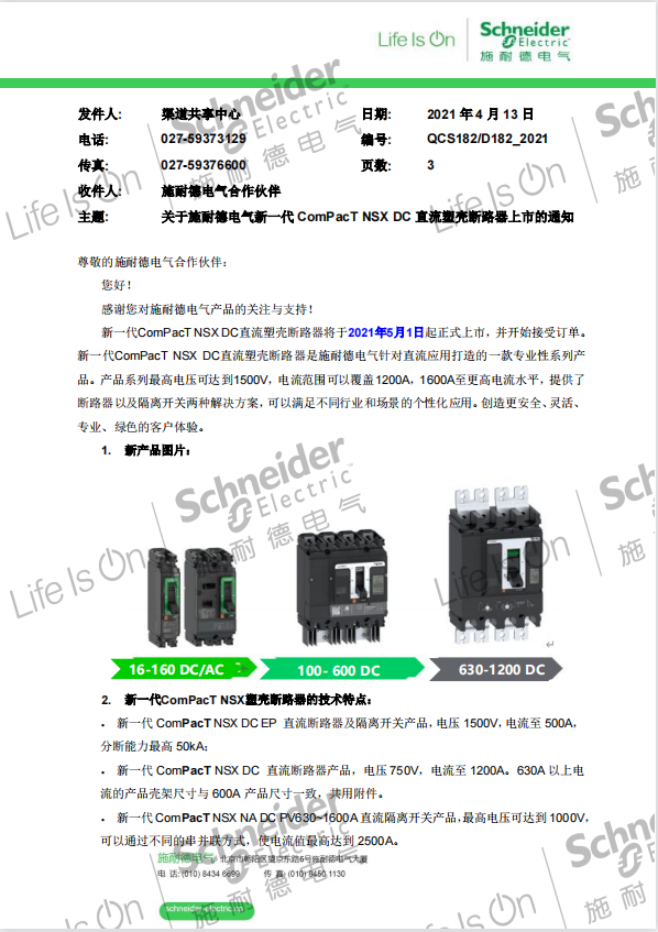关于施耐德电气新一代ComPacT NSX DC直流塑壳断路器上市的通知
