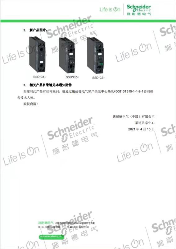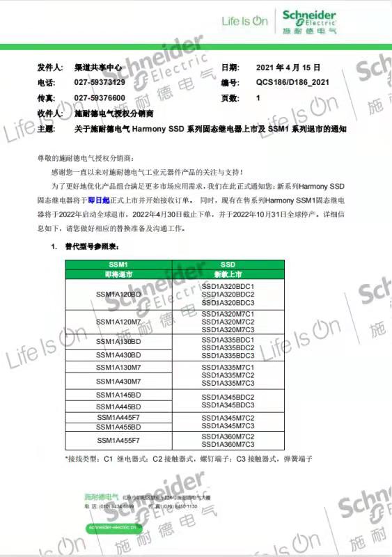 关于施耐德电气Harmony SSD系列固态继电器上市及SSM1系列退市的通知