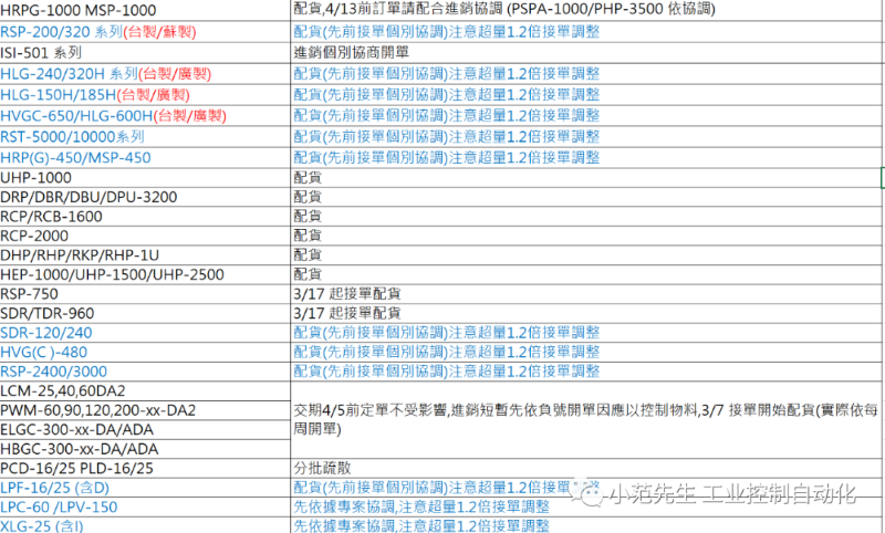 MW明纬开关电源配货型号表,货期延长。
