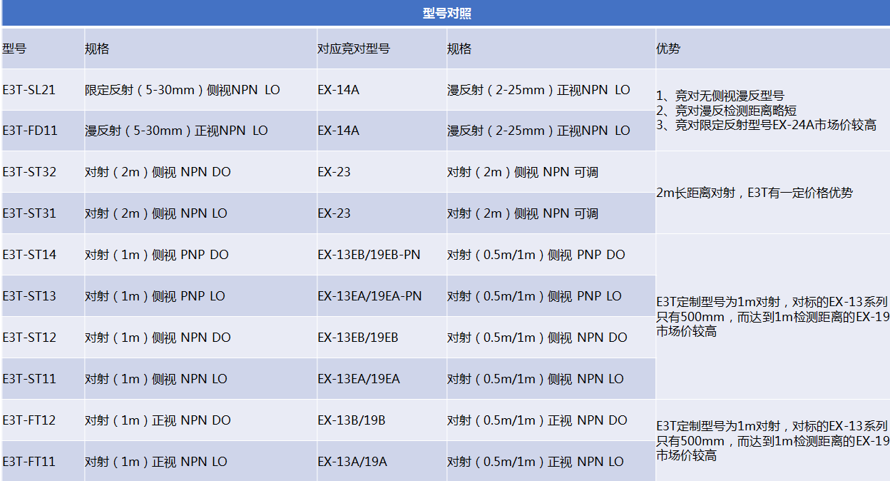 小型光电的应用集中在:电子3C产业的前段和后段,医疗设备行业中的体外诊断,Semi产业的后段,以及二次电池行业的中段和后段 有以上领域在使用可以使用推荐定制的E3T-G产品。 以下是该定制产品与松下竞品的优势对照 ![]() E3T-SL21 限定反射(5-30mm )侧视NPN LO EX-14A 漫反射(2-25mm )正视NPN LO E3T-FD11 漫反射(5-30mm )正视NPN LO EX-14A 漫反射(2-25mm )正视NPN LO E3T-ST32 对射(2m )侧视NPN DO EX-23 对射( 2m)侧视NPN可调 E3T-ST31对射( 2m )侧视 NPN LO EX-23 对射( 2m)侧视NPN可调 E3T-ST14对射( 1m)侧视 PNP DO EX-13EB/19EB-PN 对射(0.5m/1m )侧视PNP DO E3T-ST13 对射( 1m )侧视 PNP LO EX-13EA/19EA-PN对射( 0.5m/1m)侧视PNP LO E3T-ST12 对射( 1m )侧视NPN DO EX-13EB/19EB 对射(0.5m/1m)侧视NPN DO E3T-ST11 对射( 1m )侧视NPN LO EX-13EA/19EA 对射(0.5m/1m )侧视NPN LO E3T-FT12对射( 1m )正视 NPN DO EX-13B/19B 对射(0.5m/1m )正视NPN DO E3T-FT11对射( 1m )正视NPN LO EX-13A/19A 对射(0.5m/1m )正视 NPN LO |